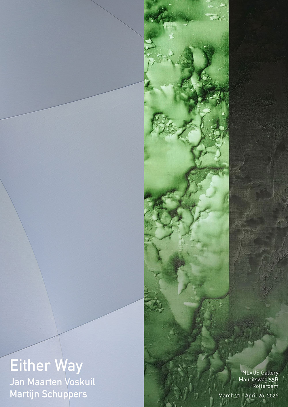 NL=US Art on Mauritsweg in Rotterdam presents the exhibition “Either Way” by Martijn Schuppers and Jan Maarten Voskuil from 21 March to 26 April. The exhibition is based on the realization that Schuppers and Voskuil, starting from the same artistic inquiry, ultimately took opposite directions. For both artists this inquiry began in the late 1980s with naturalistic painting and the question of how, as an artist, one could still give meaning to that medium. The depiction of reality was the first thing both artists quickly abandoned. What remained was the painting itself, consisting of the stretcher frame with canvas on the one hand and the paint on the other.
