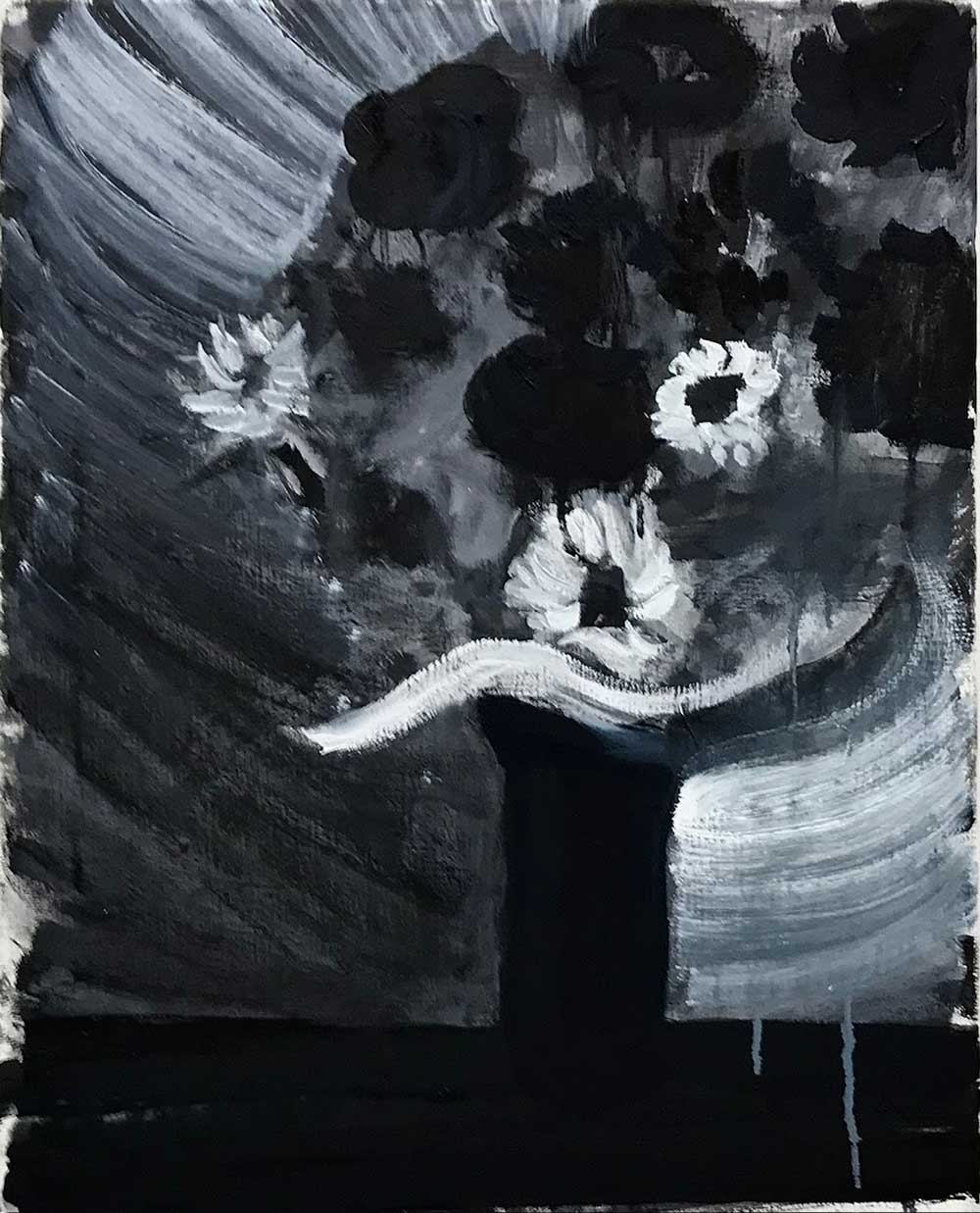 In his solo exhibition, Gerben Mulder (b. 1972, Amsterdam) returns to a central motif in his practice. Mulder stages a dialogue between restraint and exuberance. Along an eight-meter wall, the Night Bloom paintings (2020) offer intimate black-and-white meditations on form and gesture, conceived during late nights in the gallery. Flanking canvases erupt in vibrant colour, bringing the flower into bold painterly bloom. Revisiting imagery that shaped his international career, Mulder underscores the fragility and endurance of this timeless subject while supporting emerging voices, aligning his pared-down works with Vincent Zanni’s debut exhibition.
