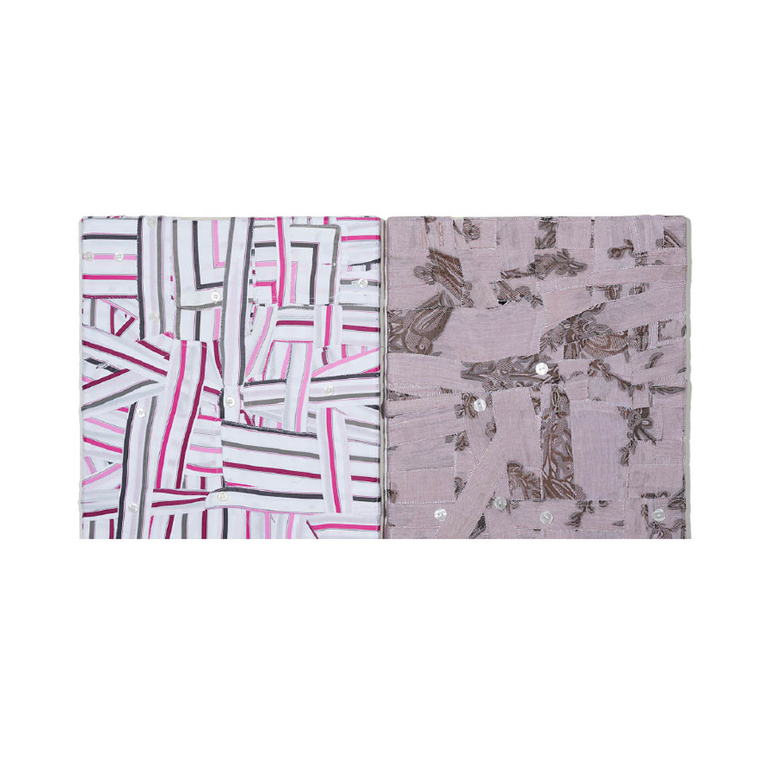 Perfect Friends unfolds as a series of 42 intimate portraits, each composed from men’s shirts once worn and given by friends, friends of friends, and acquaintances. Cut into fragments, the fabric is mounted on wooden stretchers and laboriously hand-sewn, transforming into a delicate, skin-like surface.