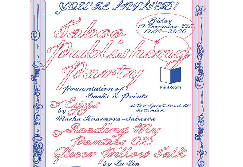 Book presentations: ~ Eggs by Masha Krasnova-Shabaeva + Presentation of Masha’s Taboo zine collection by fellow artists and WdKA illustration students & a selection of PrintRoom’s zine archive ~ Reading My Panties 02: Queer Pillow Talk by Lu Lin + Reading my Panties installation (Van Speykstraat 121)