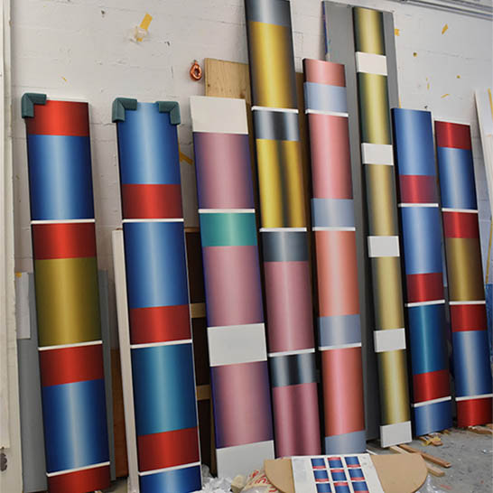 Barbara Helmer's abstract paintings explore the intricate skin of materials and the dynamic interplay of light upon them. Her work captures the subtle reflections and shimmering quality of metal, while also showcasing the unique luminosity that light imparts to various surfaces.